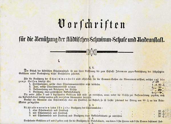 Wie schon ausgeführt, handelte es sich nicht nur um ein Bad, sondern auch um eine Schwimmschule. Der kostenpflichtige Schwimmunterricht, 15 Pfennig, wurde vom Schwimm-Meister durchgeführt. Nachfolgend ein Auszug aus den "Vorschriften für die Benützung der städtischen Schwimm-Schule und Badeanstalt":