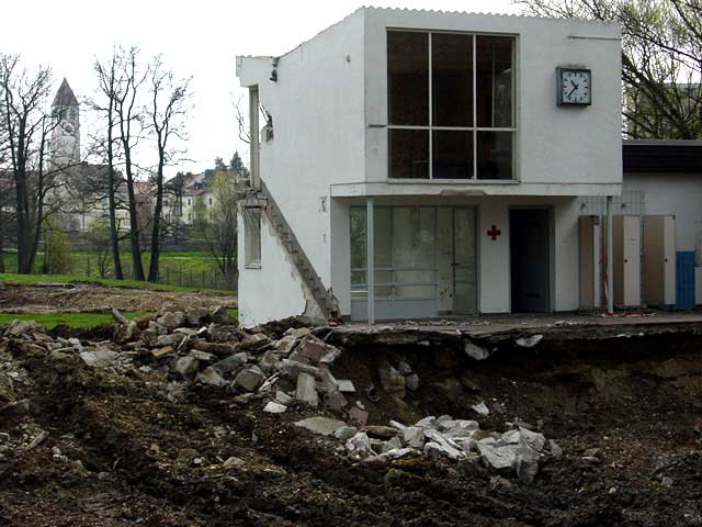 Gleich nach Beendigung der Badesaison 2003 begann die Stadt Deggendorf mit den Abbrucharbeiten. Leider wurde auch das zentrale Gebäude für die Bademeister und die technischen Anlagen zerstört, obwohl der Bildhauer Andreas Sobek den bedenkenswerten Vorschlag machte, dieses Gebäude zu erhalten und beispielsweise für Ateliers oder als Ausstellungsraum zu nutzen. Unverständlicherweise für viele wurden auch die Umkleideräume, die Toiletten und die Duschen sofort abgerissen, obwohl diese für die etwas weiter oben gelegene Beachvolleyballanlage, bei der entsprechende Anlagen fehlen, bestens geeignet gewesen wären. Offenbar sollte möglichst schnell tabula rasa gemacht und jede Erinnerung an ein für viele Bürger unserer Stadt liebenswertes Stück Deggendorf ausgelöscht werden.