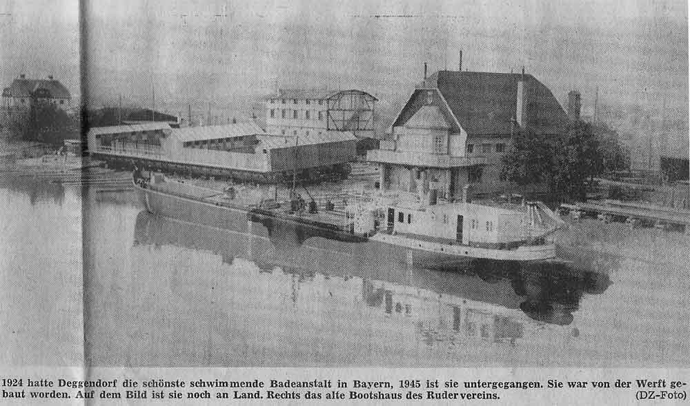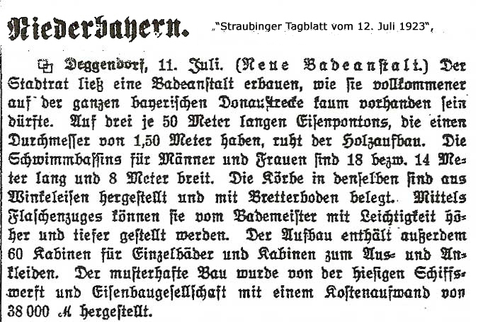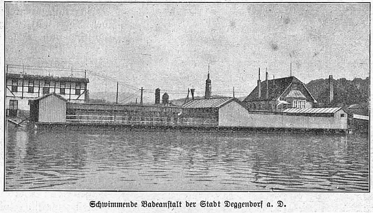 Im Jahre 1873 weist das Bezirksamt den Magistrat auf die Notwendigkeit hin, in der Donau eine Bade- und Schwimmanstalt zu errichten... Die einzige Badegelegenheit in der Bogen habe bekanntlich "die empfindlichen Schattenseiten gegen sich"... Da auch die Regierung von Niederbayern den Mangel einer Badeanstalt gerügt hatte, mussten die Deggendorfer Stadtratsmitglieder wohl oder übel in den saueren Apfel beißen und, da sich kein Privatunternehmer fand, nun selbst eine Schwimmanstalt errichten. Man wählte aber nicht die Donau, sondern den Bogen... Man ernannte eine Kommission..., diese wählte den Platz unweit der Angermühle als geeignet. Von Landshut ließ man sich die Pläne der dortigen Anstalt kommen , dazu die Badordnung. Den (privaten) Badeanstaltsbesitzer Huber (siehe oben), fand man mit 25 Gulden ab."