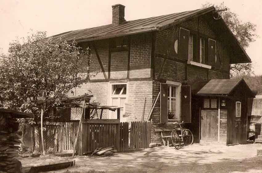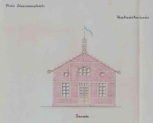 Nachfolgend der Plan des Fachwerkbaues für die Wohnung des Badewärters und Schwimmlehrers. Daneben ein Foto des nach dem Plan errichtete Hauses, im "Situationsplan" oben rot eingezeichnet, für den Schwimm-Meister. Interessant, dass der Bogenbach auf dem Plan noch einen Bogen vorne um das Haus macht , auf dem Foto unten infolge der Bachverlegung (siehe weiter unten) dann hinter dem Haus verläuft.