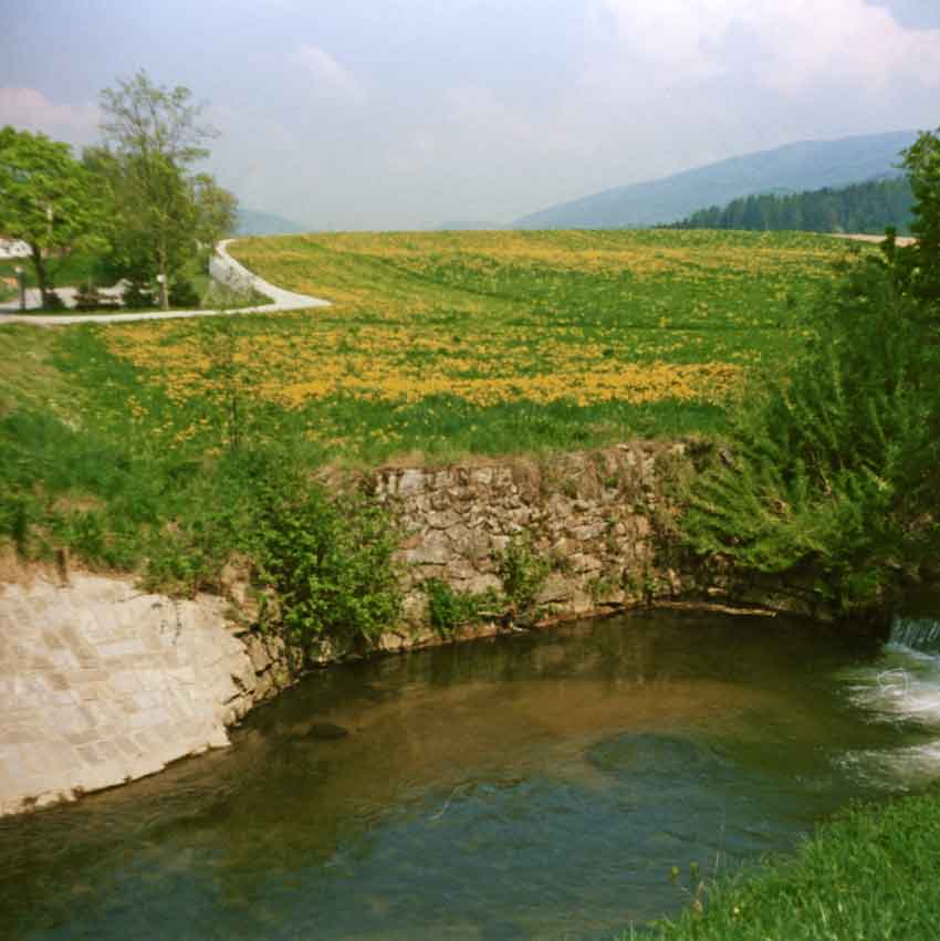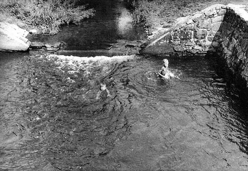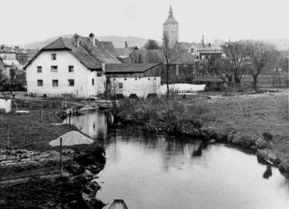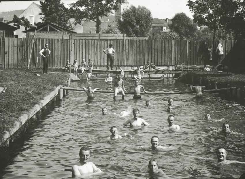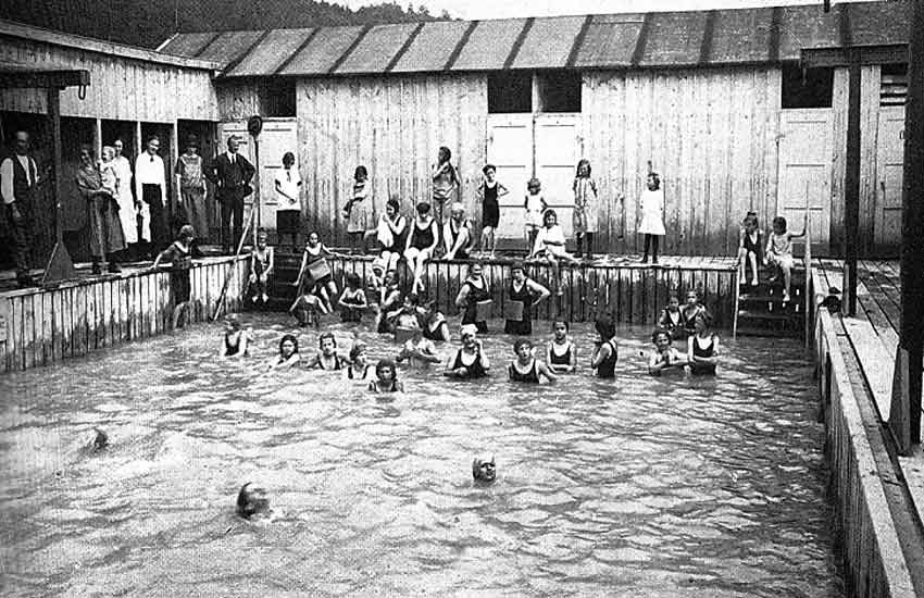 Die erste Städtische Schwimm -und Badeanstalt im Bogenbach wurde am 8. August 1874 errichtet. Hier ein Foto des Bades, "aufgenommen in den zwanziger Jahren, mit einer großformatigen Kamera auf einer beschichteten Glasplatte" (so Stadtarchivar Erich Kandler):