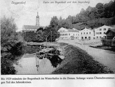 Der aus dem Graflinger Tal kommende Bogenbach, der im Oberlauf den Namen Kollbach, bis zur Einmündung des Hammermühlbaches den Namen Kohlbach (von Kohle, Holzköhlerei) und von dort ab den Namen Bogenbach führt, floss damals, wie aus nachstehenden Bildern ersichtlich, am Rande des damaligen Stadtgebietes - heute wäre dies mitten durch die Stadt - an der Stadtpfarrkirche Mariä Himmelfahrt vorbei und mündete etwa auf der Höhe des heutigen Flussmeisterhauses in die Donau.