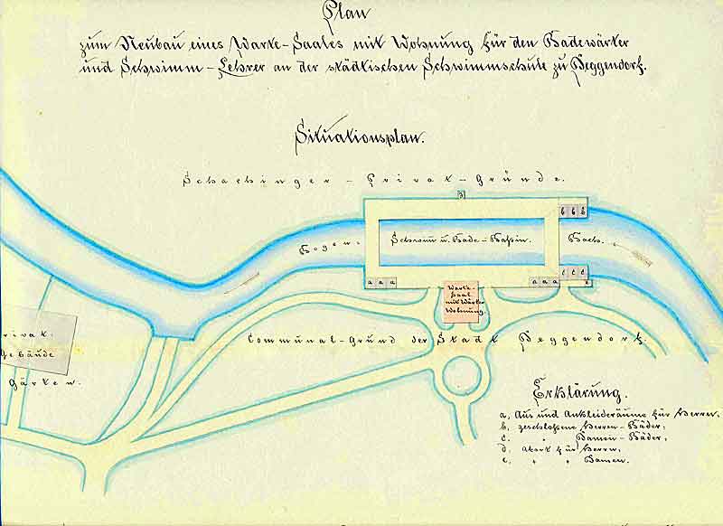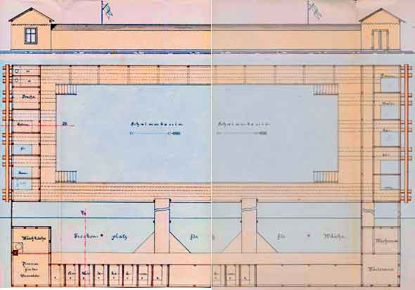 Interessant darin die "Erklärungen" rechts unten, woraus sich die Trennung sowohl der Aus- und Ankleideräume als auch der Badeanstalt für Herren und Damen ersehen lässt