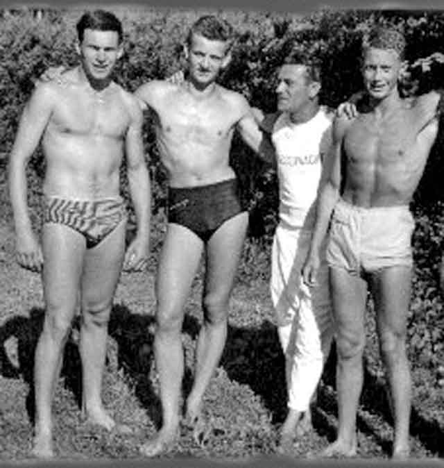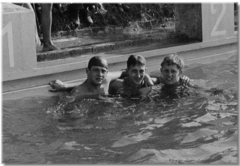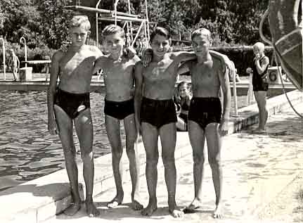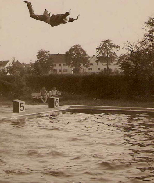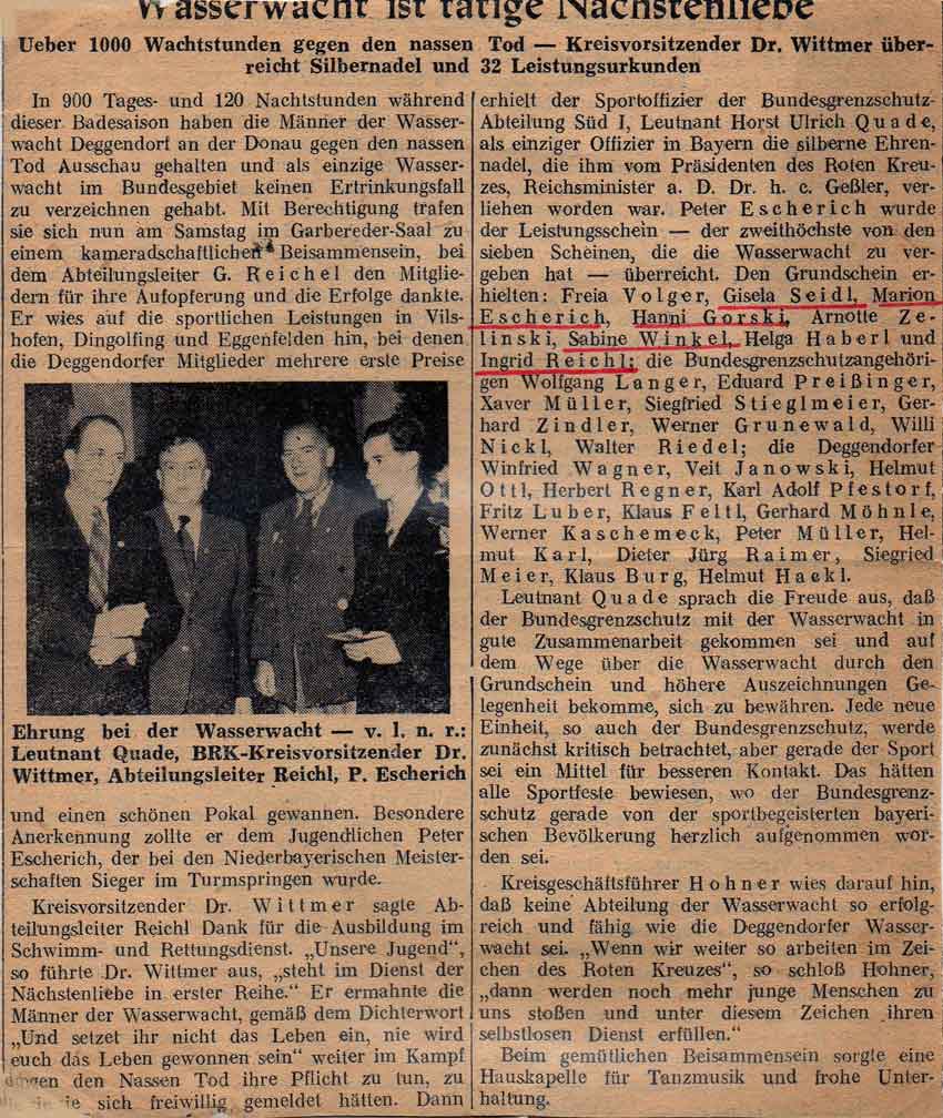 Marion Escherich wurde ebenfalls in der Jugend B in den Brustdisziplinen sowohl über 100 m in 1:41,8 Min., wie auch über 200 m in 3:49,0 Min., jeweils in besserer Zeit wie die Siegerin in der Jugend A, niederbayerische Meisterin.Der Bruder von Marion Escherich, Peter Escherich (auf dem Bild nebenan ganz vorne), war ein hervorragender Kunstspringer vom 3-m Brett und konnte sich, wenn ich mich richtig erinnere, gegen seine Hauptkonkurrenten, die Gebrüder Mehlsteibl aus Eggenfelden, durchsetzen und wurde ebenfalls niederbayerischer Meister beim Kunstspringen vom 3-m Brett.