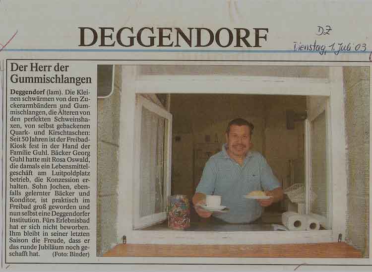 Letzte Bademeister bis zur Auflassung des Freibades waren Dieter Niedermeier und seine weiter nach und nach eingestellten Kollegen Hartl Klaus, Hilse Stefan, Pleintinger Hannes und Kilger Thomas. Niedermeier übte engagiert, mit großem Fachwissen und Sachverstand, wie übrigens seine Kollegen auch, bis zum endgültigen Schluss des Freibades am 30. September 2003 als leitender Schwimmmeister seinen Dienst aus. Allerdings habe ich von ihm, wie auch von seinen Kollegen niemals einen Sprung vom 3m-Brett, wie vom "Tell", erlebt. Dafür ist Dieter eine hervorragender Koch und als Alleinunterhalter am Nockerberg in Mietraching oder als "Stadtpolizist" einsame Spitze, ganz zu schweigen von seinen außergewöhnlichen Fähigkeiten im Freibad - Nationalsport: dem "Hudeln" (Kartenspiel). Auch in diesem Bereich standen ihm seine Kollegen Hannes, Stefan und Thomas nur wenig nach, sodass man fast annehmen muss, dass "Hudeln" zur Grundausbildung eines Schwimmmeisters gehört.