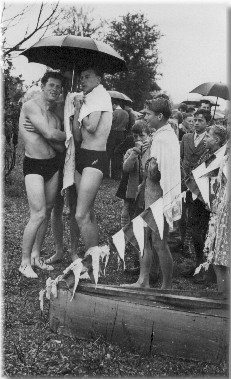 Foto: Herbert RegnerErstaunlich besonders die große Besucherzahl. Offenbar hatten die Deggendorfer damals ein Herz für den Schwimmsport. Übrigens, auf dem Sprungbrett, Dreh- und Angelpunkt des "Eckfangerl", von links: der mehrmalige Stadtmeister im Kunstspringen vom 3m-Brett Peter Escherich, daneben ich. die zwei Mädchen daneben Escherich Marion (weißer BAdemantel) und Winkl Sabine.