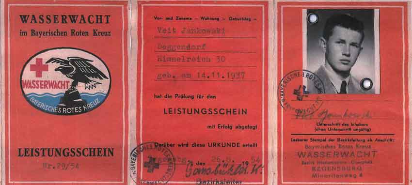 Neben manchen anderen, schaffte beispielsweise sogar den Leistungsschein der Veit "Jangi". Jankowski, ein sehr guter Krauler, der 1954 bei den Niederbayerischen Meisterschaften im Bschütt-Bad in Passau in 1:17,3 Min. geteilter Erster in der Jugend B wurde (siehe dazu weiter unten in "Schwímmsport").