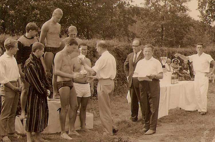 Schwimmsport:Nachstehend eine Siegerehrung, hier des Staffelwettbewerbes über 4x 50m Kraul, bei einem dem über mehrere Jahre alljährlich im Freibad stattfindenden Schwimmfeste der Wasserwacht, vermutlich 1963. Die Ehrung führte SPD-Oberbürgermeister Berthold Heckscher durch, der dem Mannschaftsführer der siegreichen Deggendorfer Staffel Walter Cehak, assistiert vom Vorsitzenden der Deggendorfer Wasserwacht Grimm N. im weißen Hemd, den Pokal überreicht. Neben Cehak und dahinter von rechts die weiteren Mitglieder der Staffel Hörner Lothar, Feichtinger Hans und Reith Werner. Die andere Staffel und deren Mitglieder sind nicht bekannt. Ganz rechts außen Bademeister Alfons Böhm.